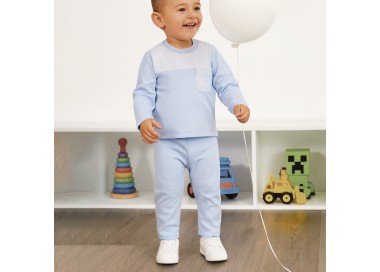 Chándal Rapife 100% Hecho en España (100% Made in Spain). Chándal para bebé de felpa 100% algodón realizada en nuestras instalaciones. Aplicación y bolsillo en tejido sarga mil rayas celestes 100% algodón.