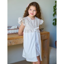 Bata de comunión rapife. Realizada en punto liso de algodón y tejido con estampado floral/liberty 100% algodón. Mangas de volantes y cierre delantero mediante lazada. Composición: 100% Algodón. Rapife 100% Made in Spain.