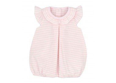 Nuestro pelele de bebé de verano tiene un cuello y mangas de tipo volante y un fuelle central de estilo muy femenino.