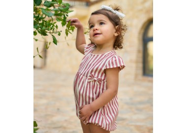 Nuestro pelele de rayas en tonos crudos combinados con rojo es una opción ideal para combinar elegancia y comodidad en todo tipo de eventos.