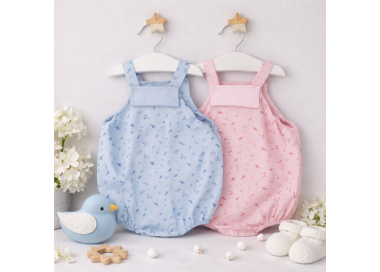 Peleles peto para bebé con delicado estampado de pajaritos y hojas, disponibles en suaves tonos celeste y rosa. Confeccionados en tejido transpirable, ofrecen máxima comodidad y libertad de movimiento para la piel sensible del bebé.
