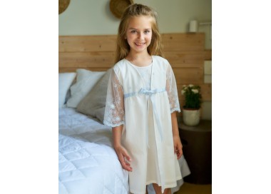 Bata de Comunión Rapife confeccionada en un elegante tejido de voilè 100% algodón con detalles en el delantero y mangas de tul bordado azul floral. Nuestra bata de Comunión tiene el cierre en la parte delantera mediante lazada con cintería y mangas francesas realizadas en el mismo tul azul floral Composición: Forro interior 100% Algodón | Tejido de tul 100% poliéster | Made in Spain.