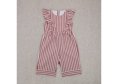 Este mono de bebé tiene unos volantes sobre los hombros y abertura trasera mediante botones a presión. Además su tejido de rayas en color marino hace de este mono una prenda muy fácil de combinar co gran variedad de calzado y complementos.
