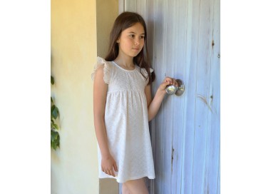Camisón de Primera Comunión para niña con tejido floral bordado combinado con un patrón con volantes en las mangas que hace de esta prenda un camisón muy especial perfecto para regalar a nuestras niñas el día de su Primera Comunión.