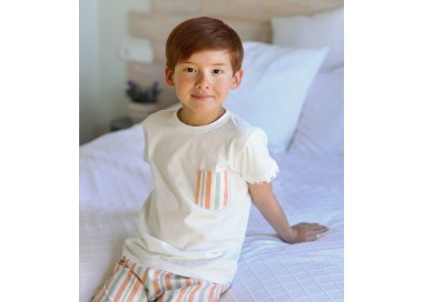 Nuestro pijama dos piezas se compone de una camiseta en color crudo 100% algodón con bolisllo y vivos en las mangas realizados en tejido de rayas efecto lino. La bermuda está realizada en el mismo tejido rayado.